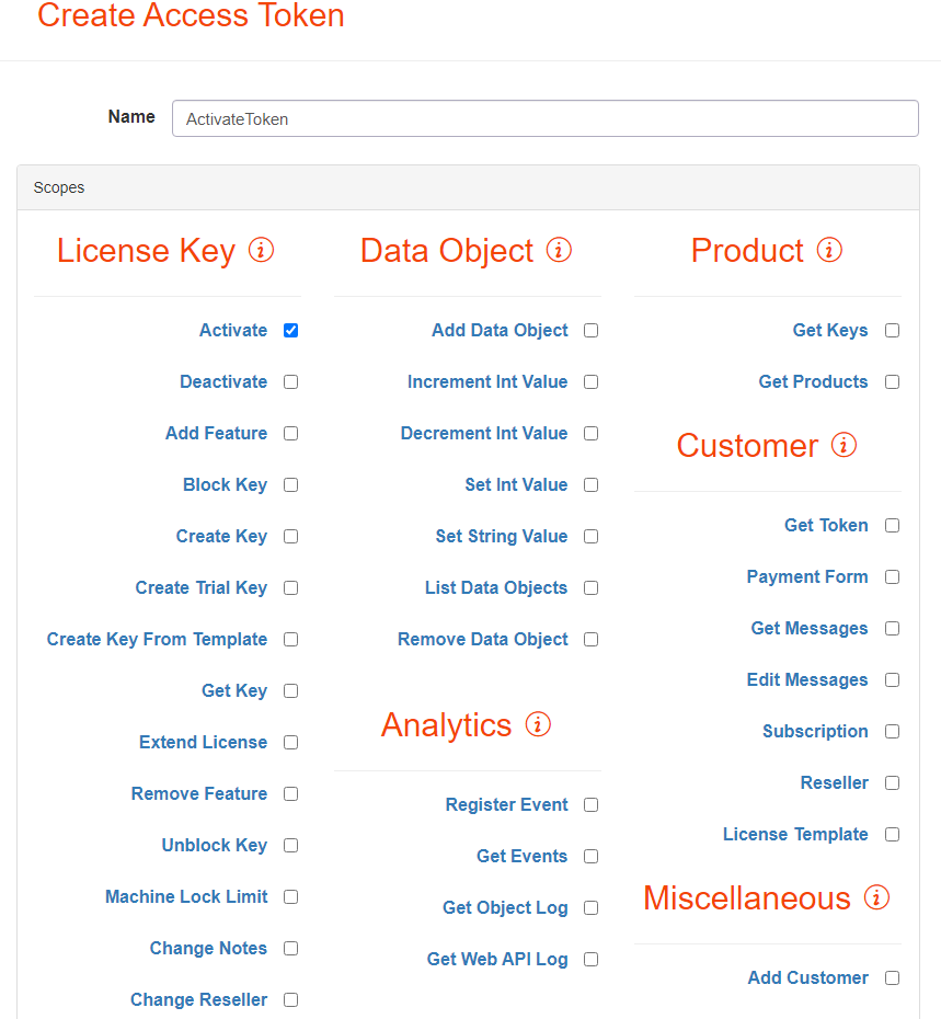 Using an access token, you can specify the methods you want to be able to call, the product you want to use, the license key, and optionally feature you want to change. You can read more about them here.